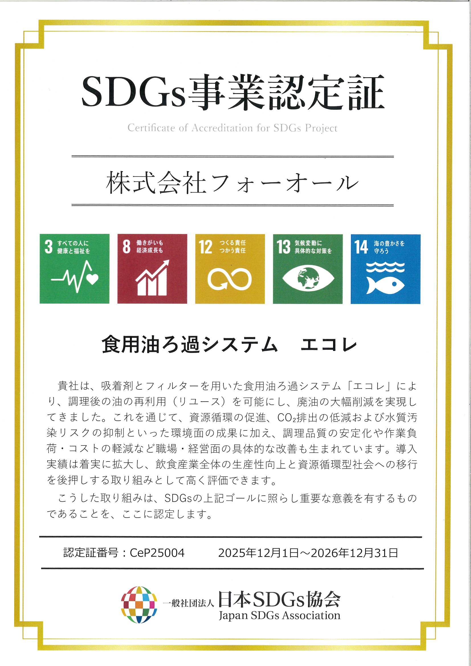 この取り組みの一環として、一般社団法人日本SDGs協会より「SDGs企業認定」および「SDGs事業認定」を取得しました。