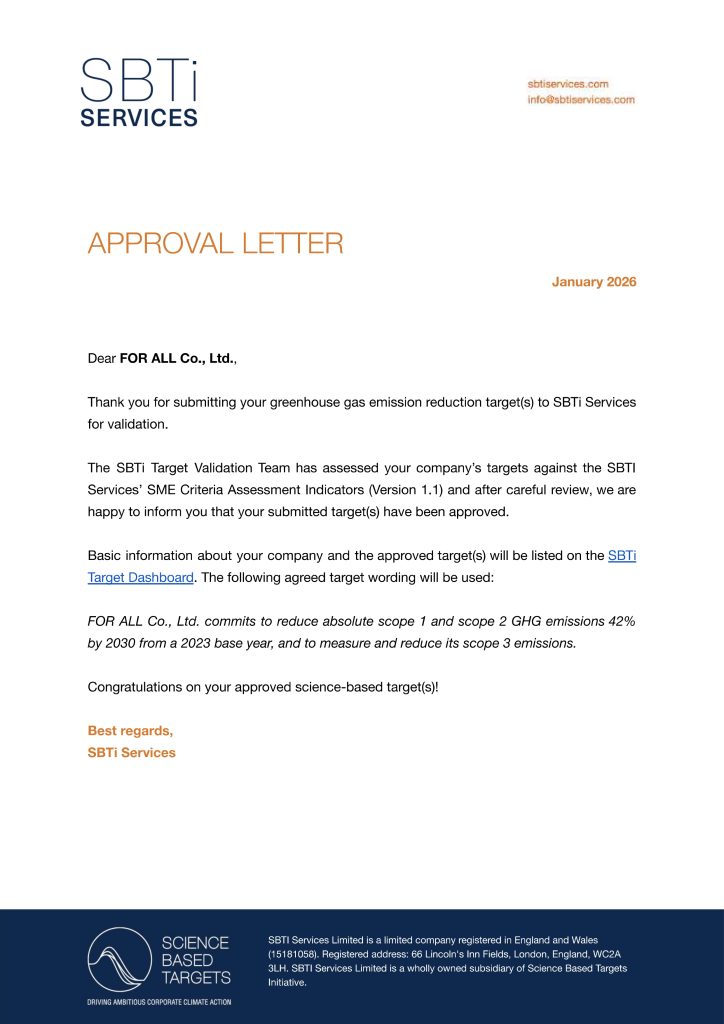 当該目標について弊社はSBT(Science Based Targets)の認証機関による認定を取得いたしました。